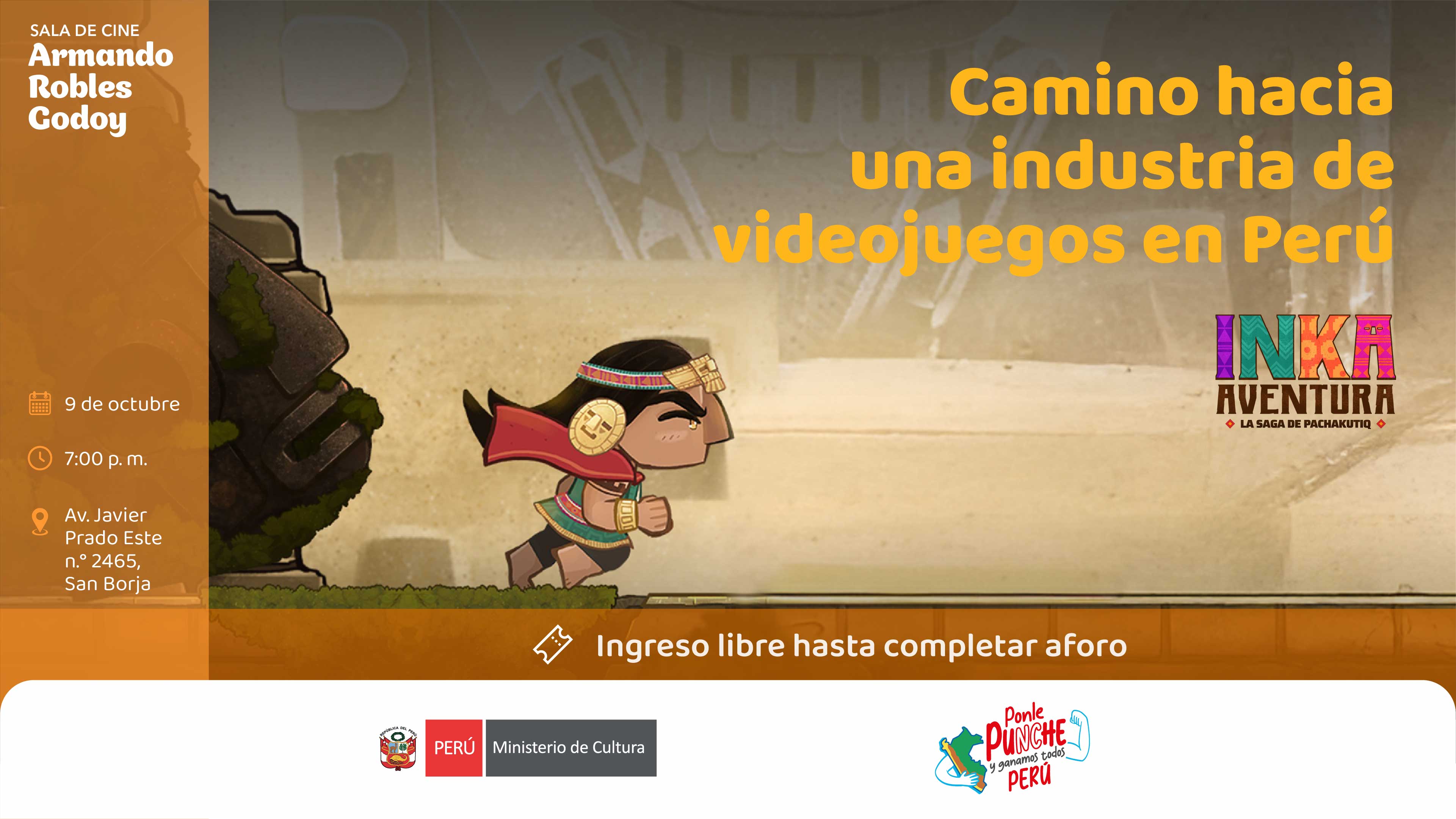 El Ministerio de Cultura del Perú presenta este jueves 9 de octubre la actividad de devolución a la ciudadanía “Camino hacia una industria de videojuegos en Perú” en la sala de cine Armando Robles Godoy.