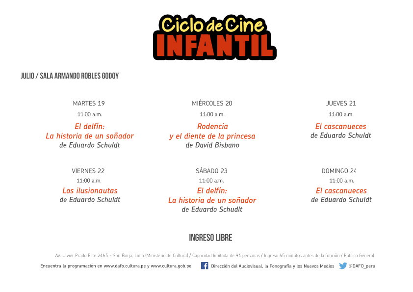 En el marco de la Semana de la Cultura que se llevará a cabo en el Ministerio de Cultura del 18 al 24 de julio, realizaremos el Ciclo de cine infantil, con una selección de películas animadas como 'Los ilusionautas' de de Eduardo Schuldt, 'Rodencia y el diente de la princesa' de David Bisbano, 'El delfín, la historia de un soñador' de Eduardo Schuldt y 'El cascanueces' de Eduardo Schuldt.
