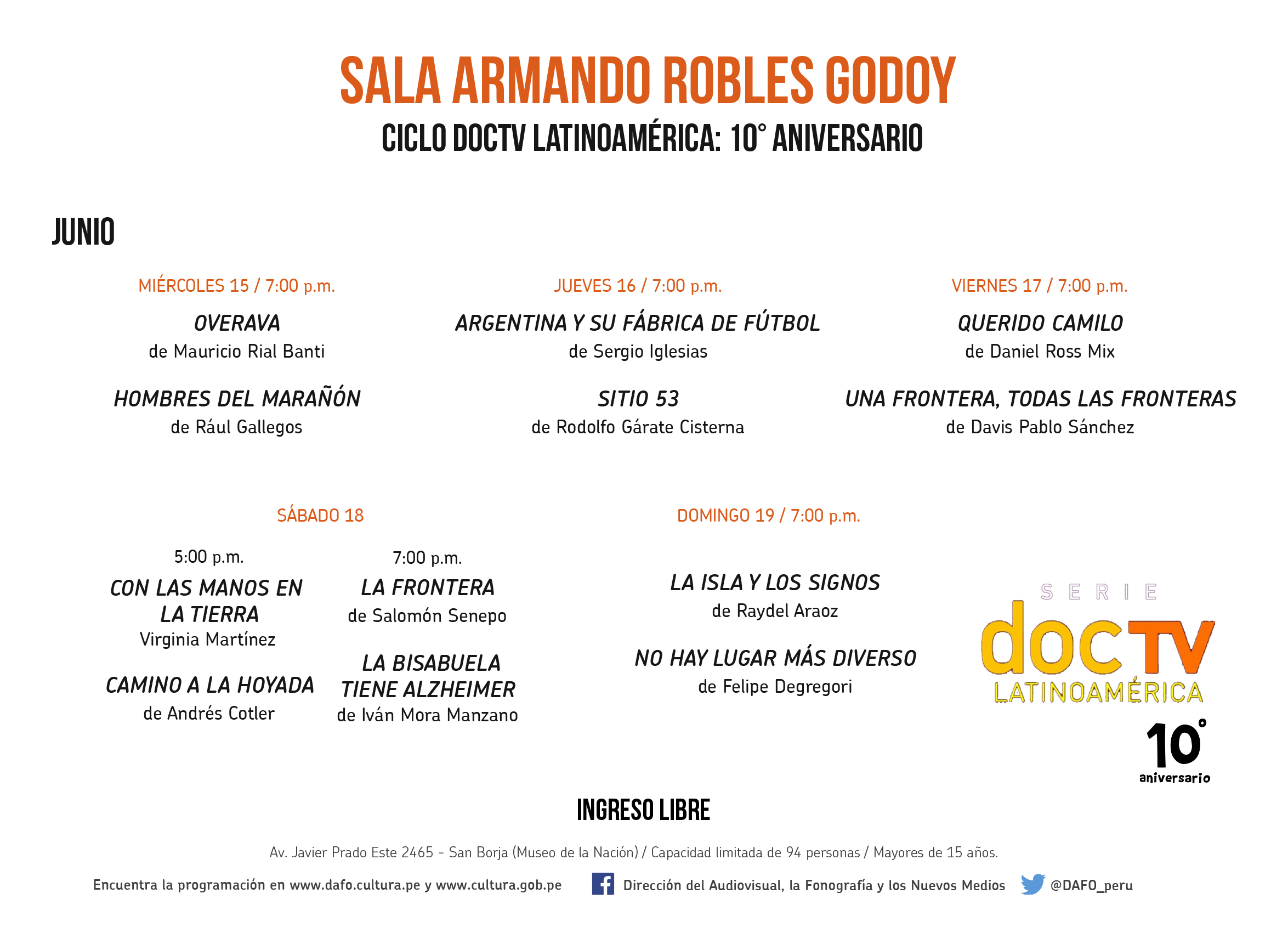 El ingreso es libre al ciclo Doctv Latinoamérica: 10° aniversario (de miércoles a domingo a las 7:00p.m., con una función adicional el sábado 18 a las 5.00 p.m.) en la sala Armando Robles Godoy, ubicada en el Ministerio de Cultura (Av. Javier Prado Este 2465 San Borja).
