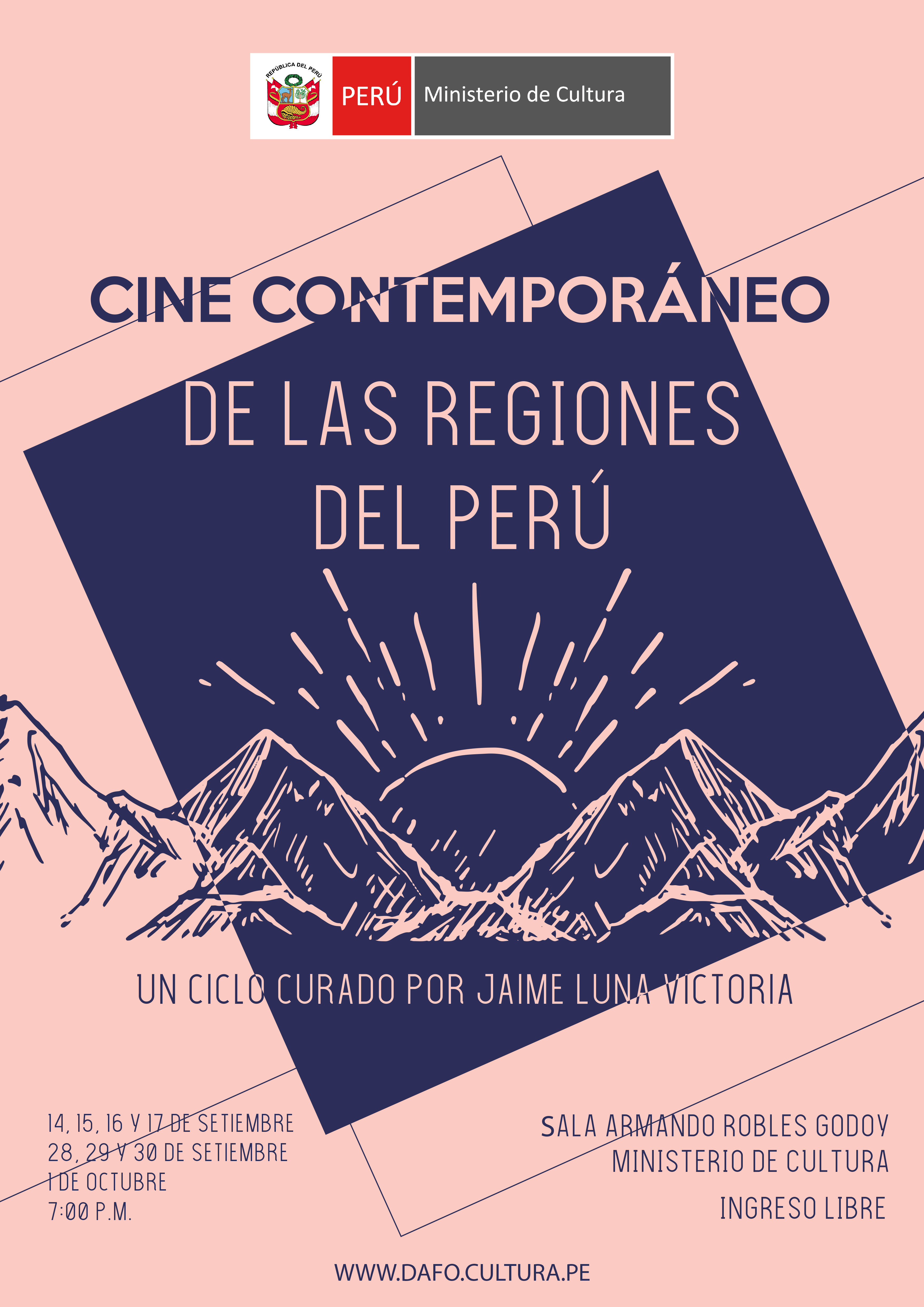 El Ministerio de Cultura presentará en la Sala de Cine Armando Robles Godoy el Ciclo de “Cine Contemporáneo de las Regiones del Perú”, donde se exhibirá 8 películas peruanas de manera gratuita.
