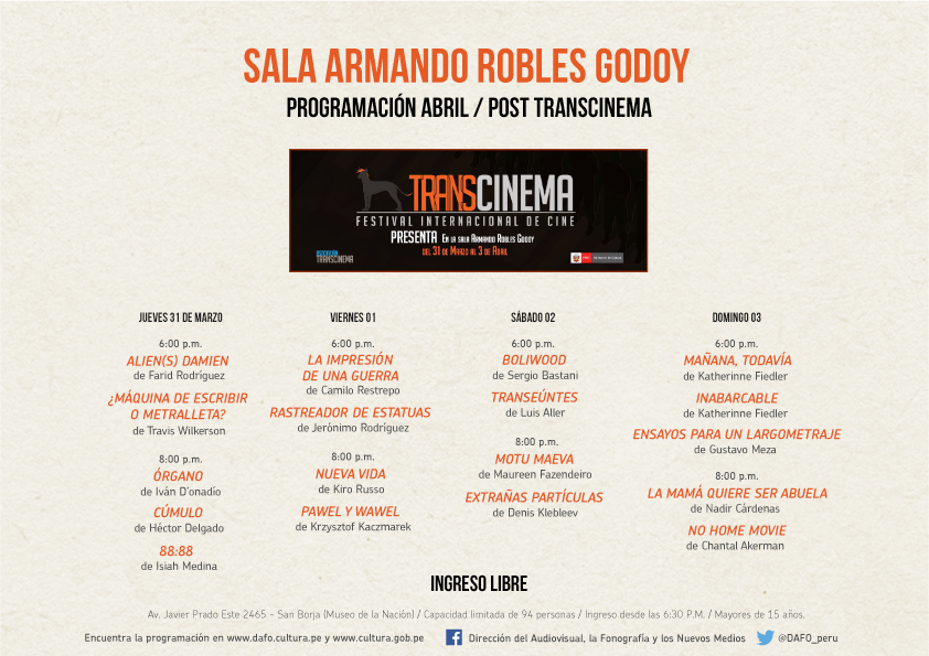Del 31 de marzo al 03 de abril, en la sala Armando Robles Godoy, se realizará 'Post Transcinema: Sesiones transcinemáticas', proyecciones cinematográficas con una selección del Festival Transcinema cuyo objetivo es ser un espacio de reflexión crítica del cine y sus nuevas formas de expresión. Su programación se especializa en el documental de autor, el cine experimental y las ficciones no convencionales. Descarga aquí la programación y conoce las sinopsis en el Facebook del evento.