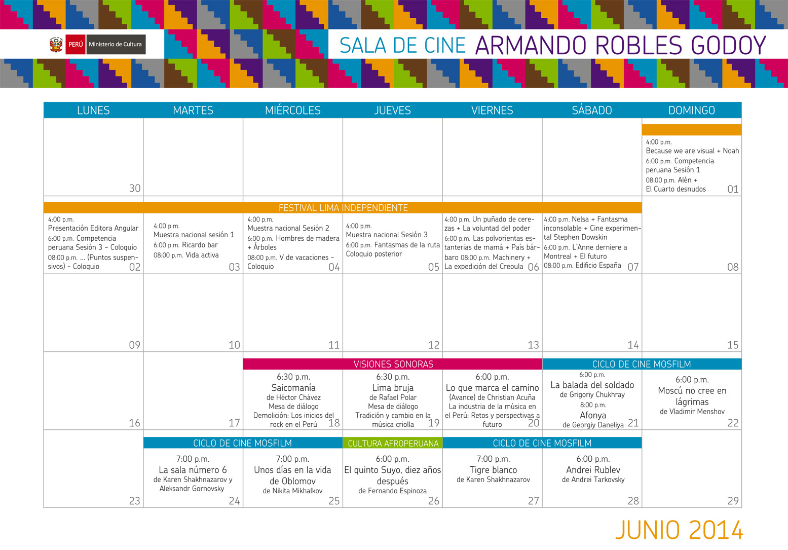 Las funciones de la sala Armando Robles Godoy, ubicada en la Av. Javier Prado 2465 San Borja, son de ingreso libre y en diferentes horarios según programación (6:00, 7:00 Y 8:00 p.m.).
