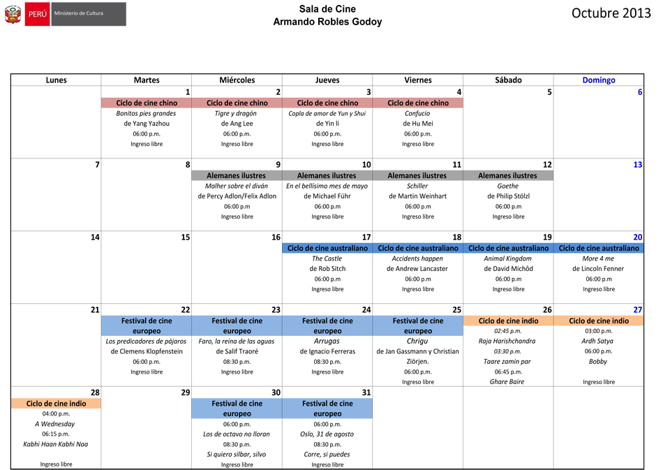 Este mes podrán encontrar una variada programación en la sala de cine del Ministerio: cine chino, alemán, australiano, indio; también contaremos con el 25° Festival de cine europeo.