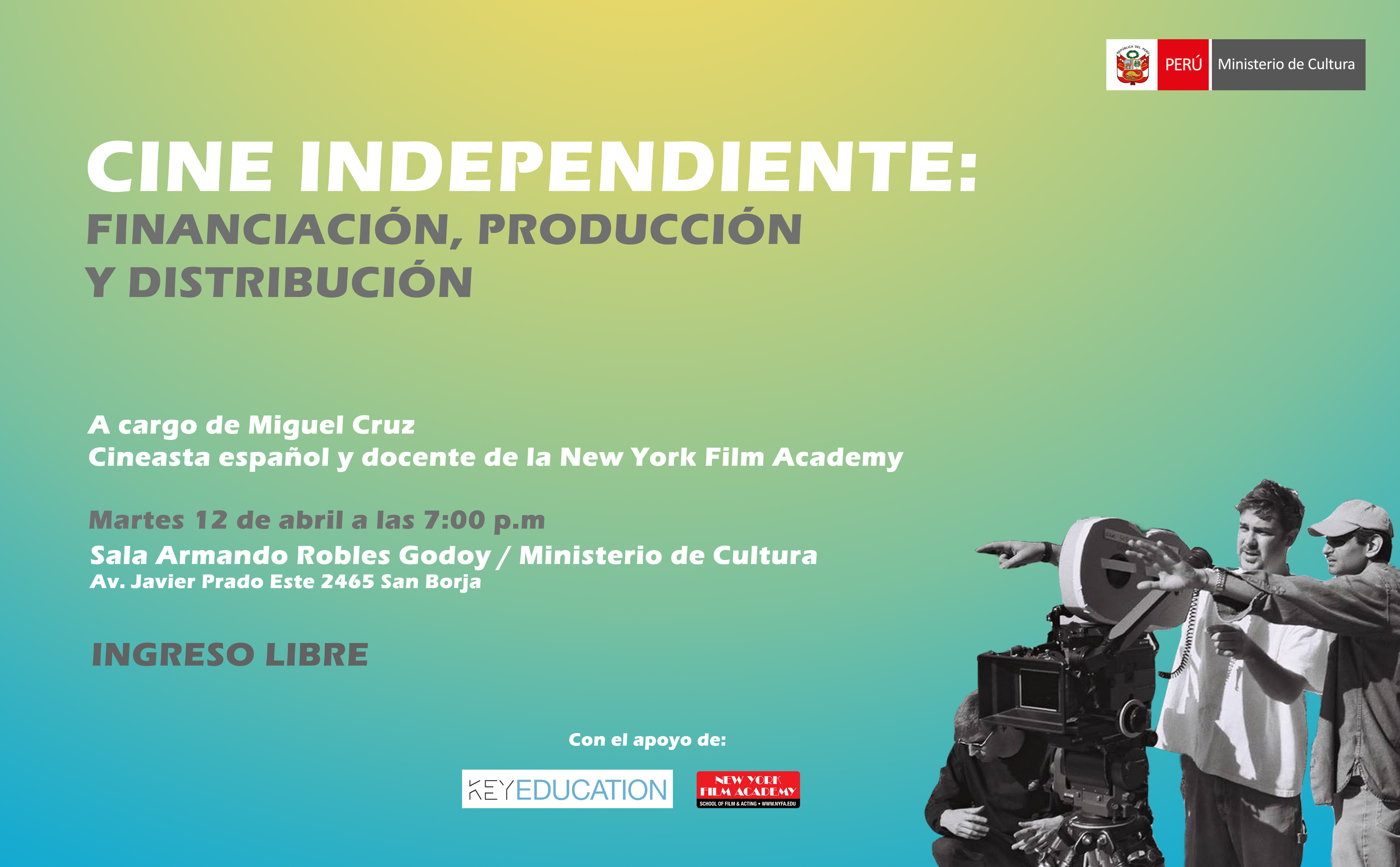 Este taller, organizado por el Ministerio de Cultura con el apoyo de Key Education, guiará a los interesados en el proceso de producir una película independiente, con el fin de competir con éxito con la cartelera y aprender a valorar la importancia del trabajo actoral. Los temas a tratar incluyen la definición de cine independiente, las distintas fuentes de financiación para producirlo, la importancia del guión y herramientas para realizar un buen pitching, así como aspectos relativos a la producción y la distribución cinematográfica.