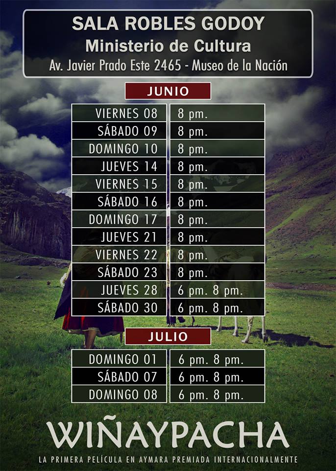 Tras su paso por festivales internacionales y su exhibición comercial en cines a nivel nacional, "WIÑAYPACHA", el primer largometraje peruano en lengua aimara, se estrenará en la Sala Armando Robles Godoy del Ministerio de Cultura del Perú