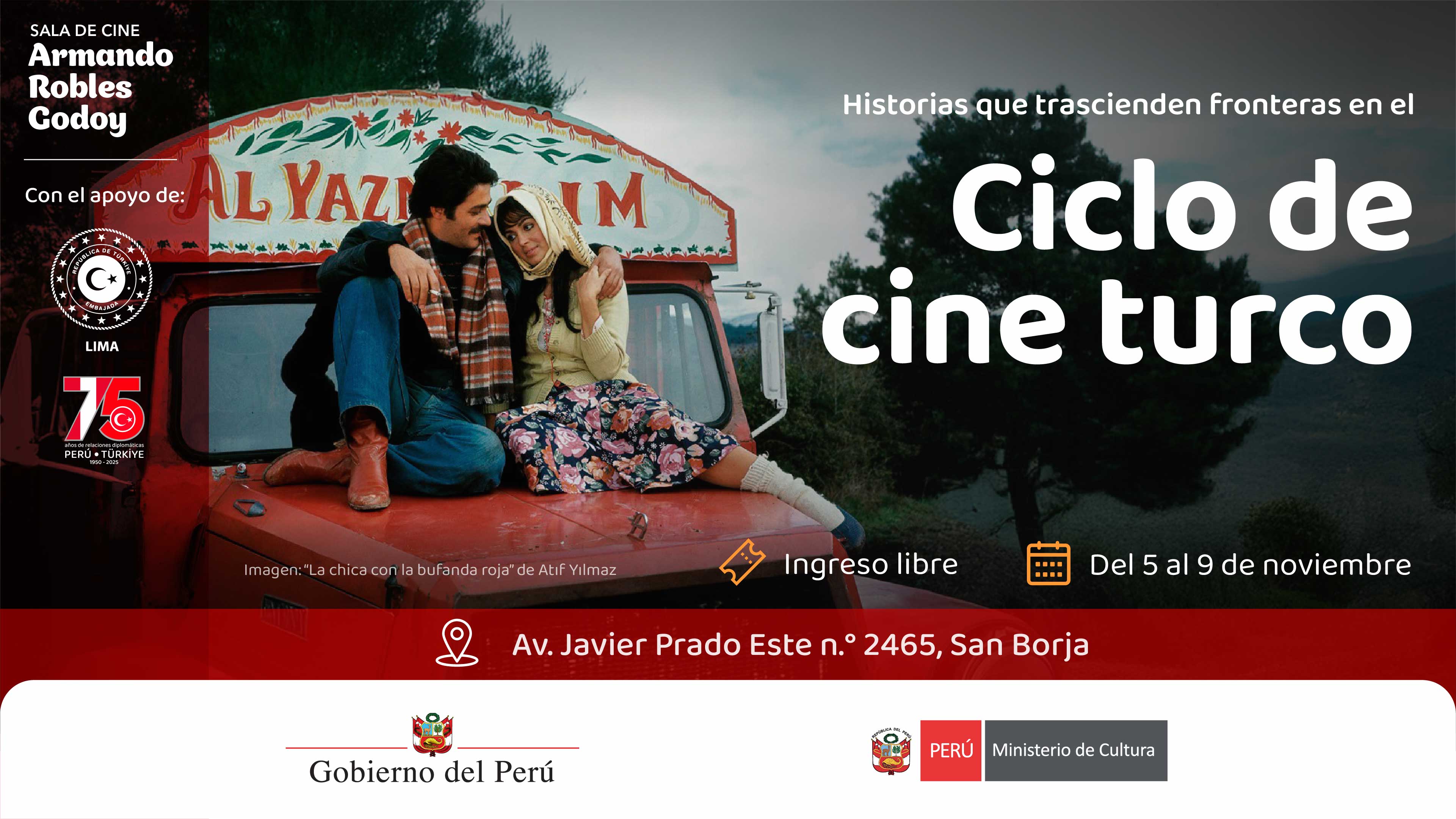 El Ministerio de Cultura del Perú y la Embajada de Türkiye en el Perú, presentan el Ciclo de cine turco 2025, evento que se realizará del miércoles 5 al domingo 9 de noviembre en la sala Armando Robles Godoy, en el marco de la celebración por los 75 años de relaciones diplomáticas entre ambas naciones.