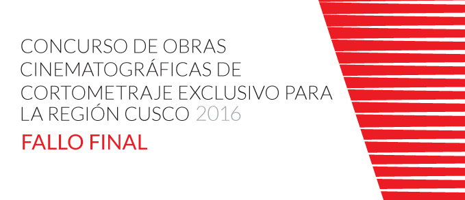 La Dirección del Audiovisual, la Fonografía y los Nuevos Medios del Ministerio de Cultura publica la RD N° 437-2016-DGIA-VMPCIC/MC  que comunica el fallo final del ‘Concurso de obras cinematográficas de cortometraje exclusivo para la región Cusco – 2016’.