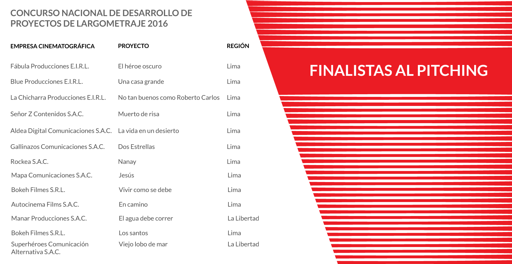 La Dirección del Audiovisual, la Fonografía y los Nuevos Medios publica la relación de proyectos finalistas al pitching del Concurso nacional de desarrollo de proyectos de largometraje 2016.