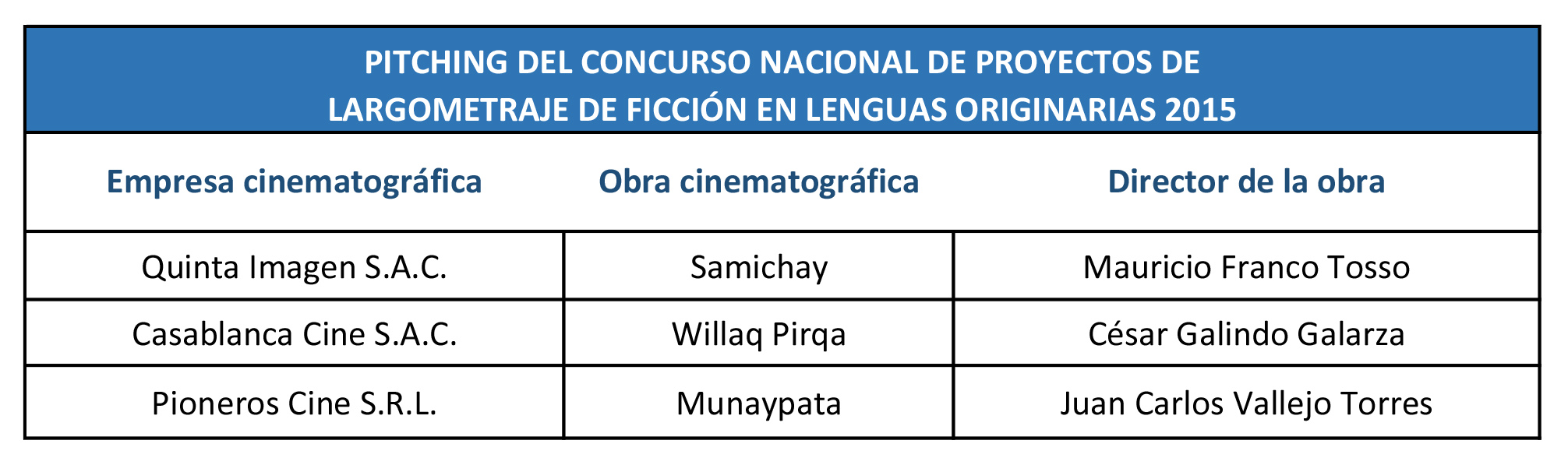 La Dirección del Audiovisual, la Fonografía y los Nuevos Medios publica la relación de proyectos finalistas al pitching del Concurso Nacional de Proyectos de Largometraje de Ficción en Lenguas Originarias 2015: