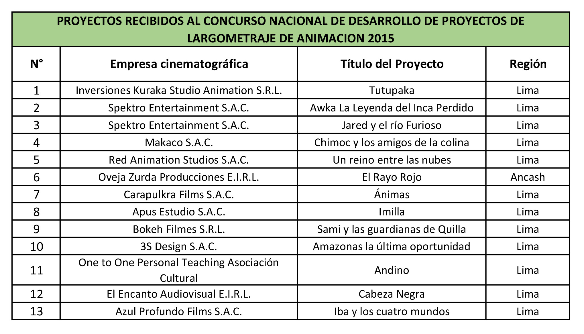 La Dirección del Audiovisual, la Fonografía y los Nuevos Medios publica la relación de proyectos recibidos al Concurso Nacional de Desarrollo de Proyectos de Largometraje de Animación 2015: