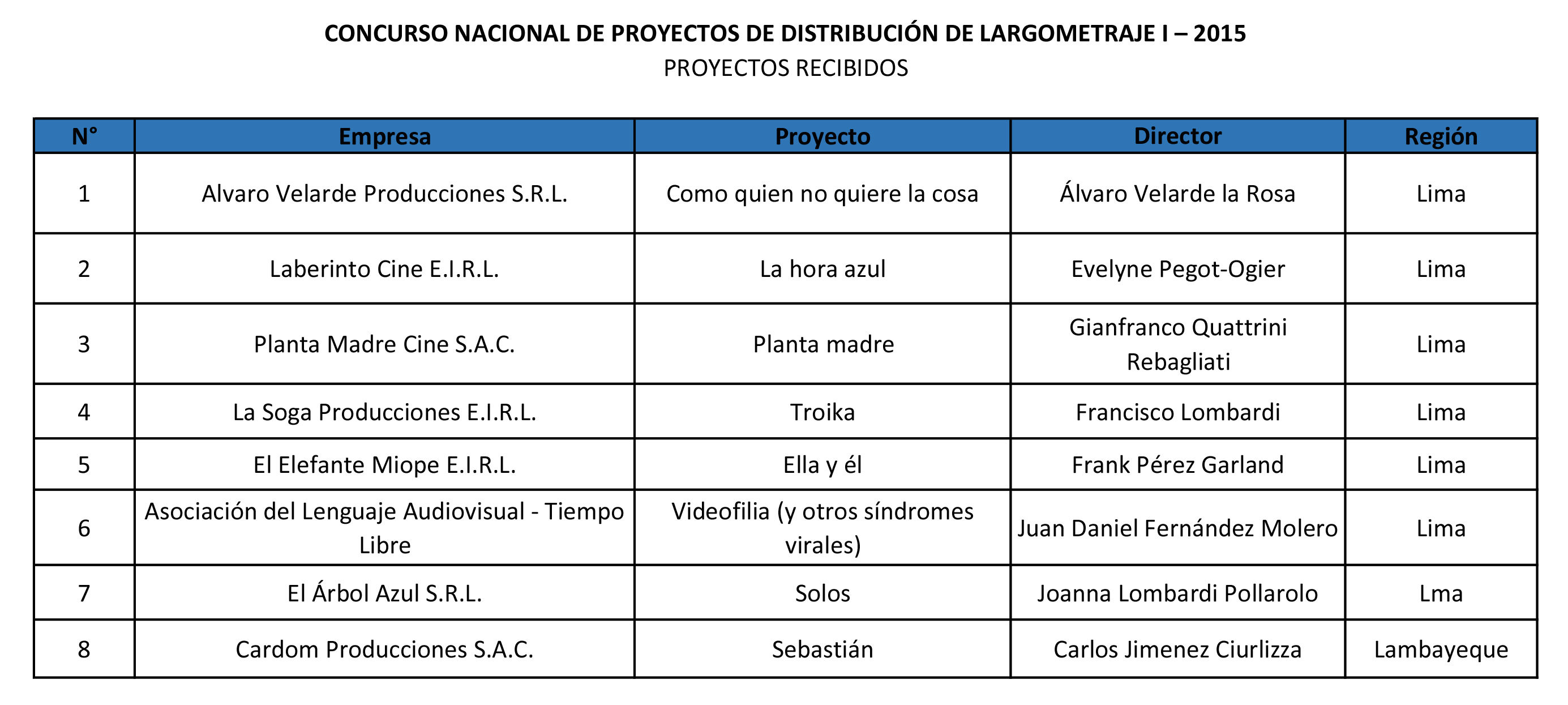 La Dirección del Audiovisual, la Fonografía y los Nuevos Medios publica la relación de proyectos recibidos al Concurso Nacional de Proyectos de Distribución de Largometraje I - 2015.