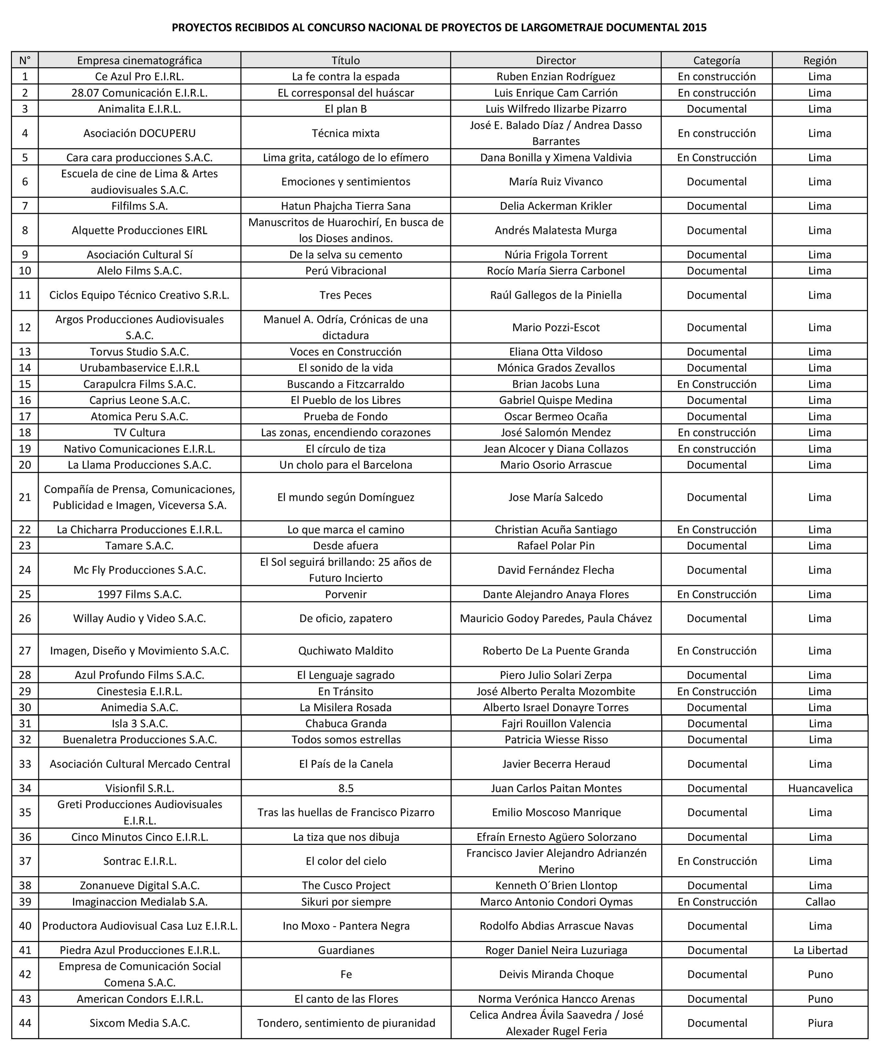 La Dirección del Audiovisual, la Fonografía y los Nuevos Medios publica la relación de proyectos recibidos al Concurso Nacional de Proyectos de Largometraje Documental 2015: