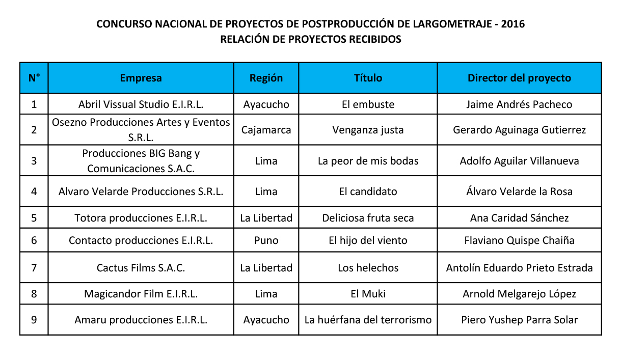 La Dirección del Audiovisual, la Fonografía y los Nuevos Medios publica la relación de proyectos recibidos al Concurso Nacional para la Formación Cinematográfica 2016.