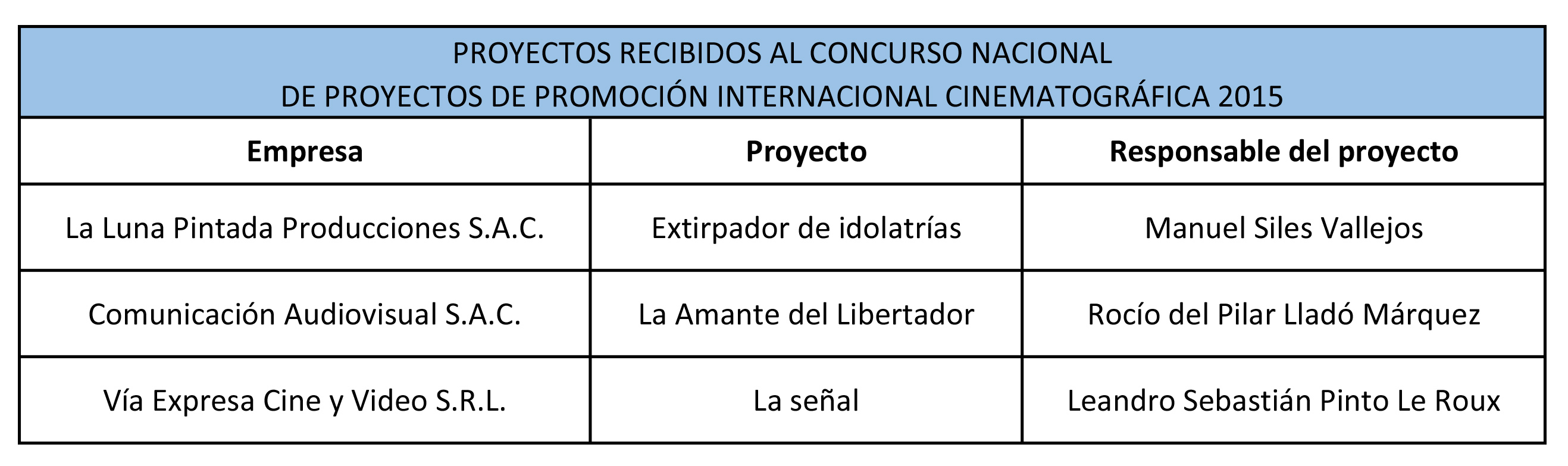 La Dirección del Audiovisual, la Fonografía y los Nuevos Medios publica la relación de proyectos recibidos al Concurso Nacional de Proyectos de Promoción Internacional Cinematográfica 2015: