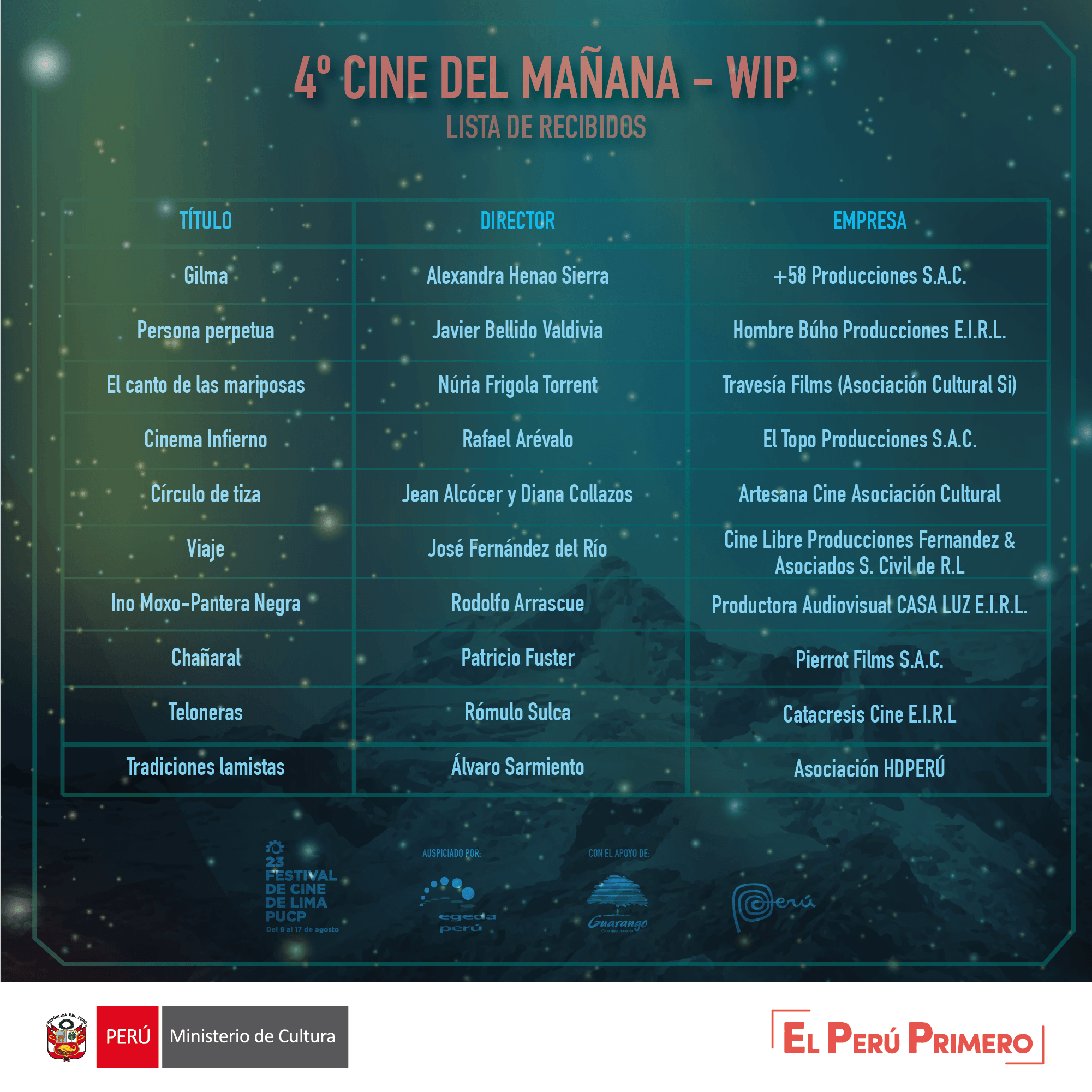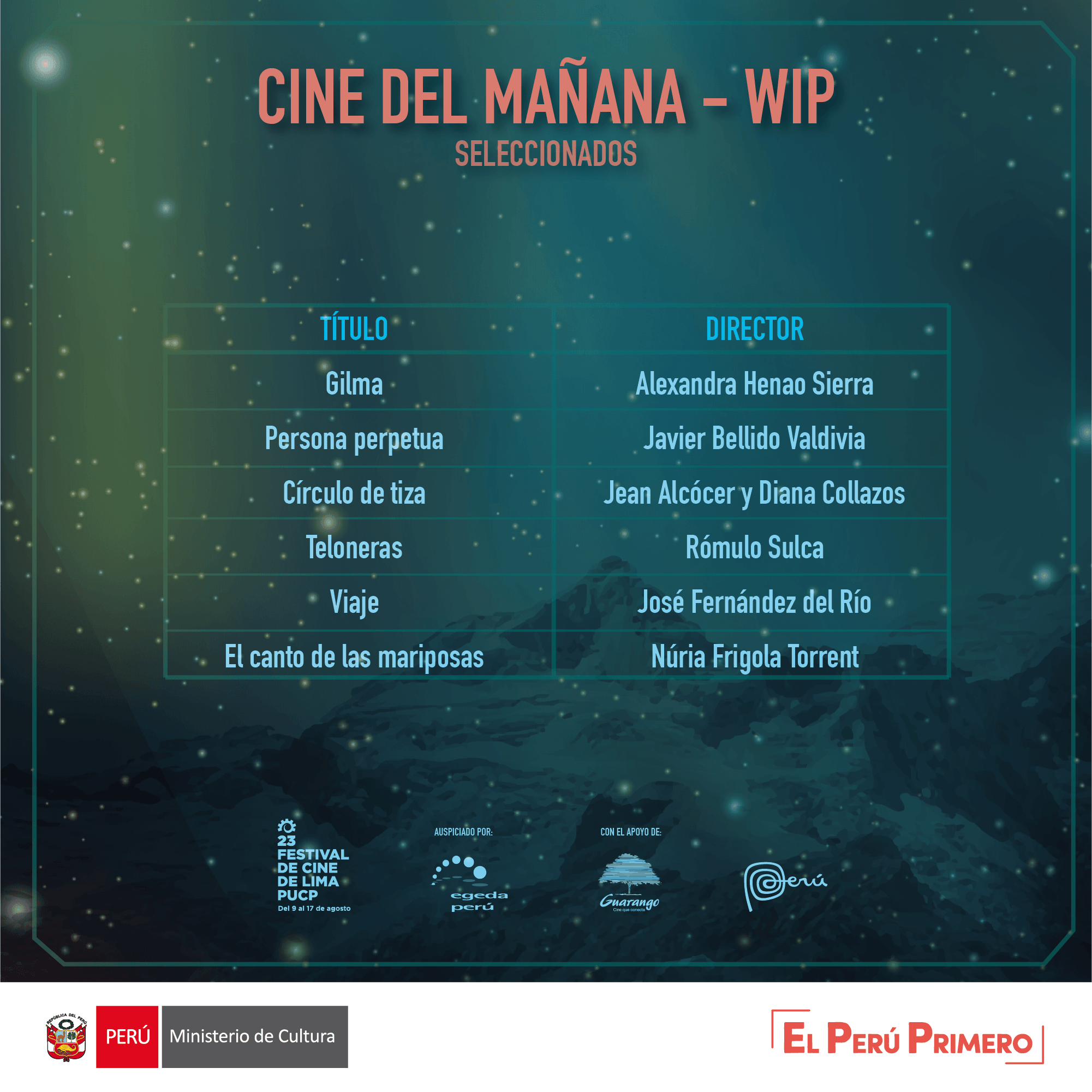 En el marco del 23° Festival de Cine de Lima, la Dirección del Audiovisual, la Fonografía y los Nuevos Medios (DAFO) del Ministerio de Cultura y el Centro Cultural de la Pontificia Universidad Católica del Perú convocan a la cuarta edición de Cine del mañana - Work in Progress (WIP), sección profesional del festival que presenta obras cinematográficas de largometraje en fase de postproducción ante reconocidos programadores de festivales y distribuidores, nacionales e internacionales.