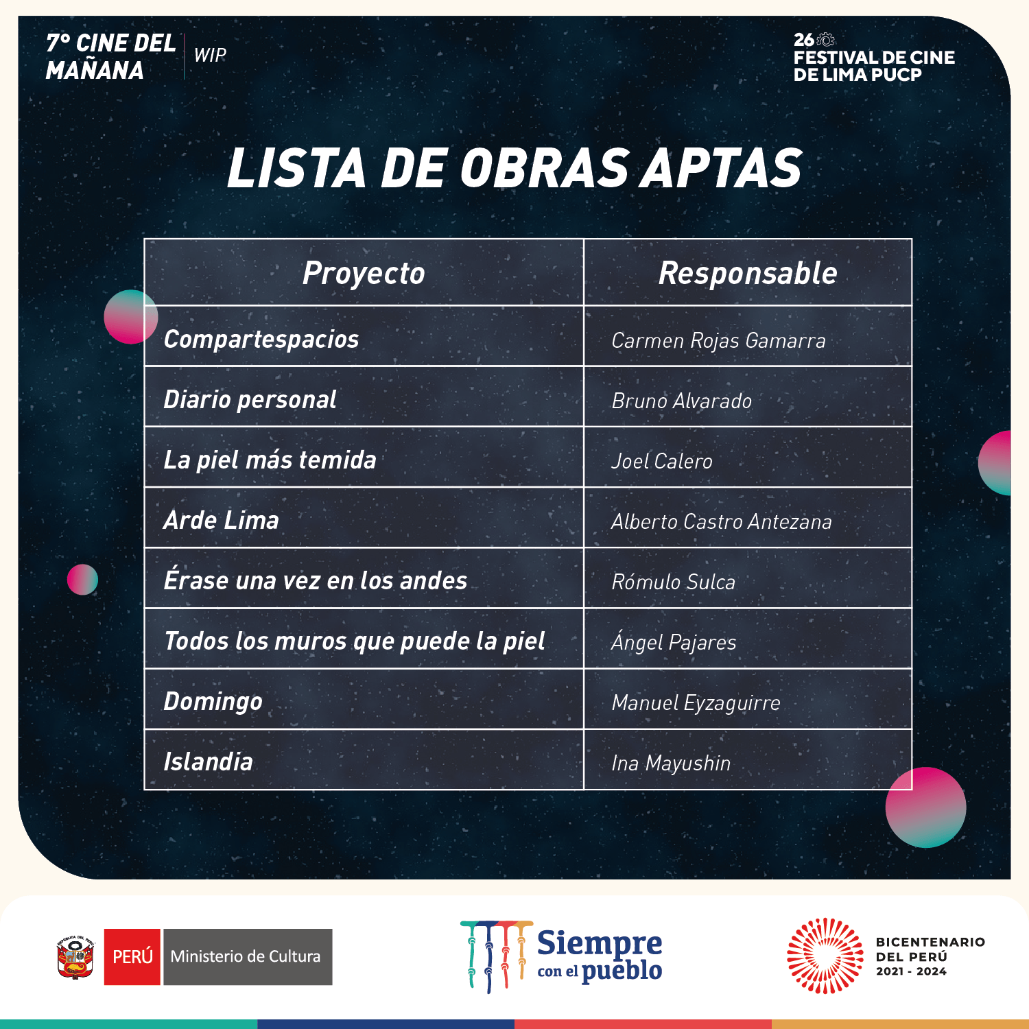 En el marco del 26º Festival de Cine de Lima PUCP, la Dirección del Audiovisual, la Fonografía y los Nuevos Medios (DAFO) del Ministerio de Cultura y el Centro Cultural de la Pontificia Universidad Católica del Perú (CCPUCP) convocan a la séptima edición de Cine del mañana – Work in Progress (WIP) 2022, sección profesional del festival que presenta proyectos cinematográficos de largometraje en fase de postproducción ante reconocidos programadores de festivales y distribuidores, nacionales e internacionales.