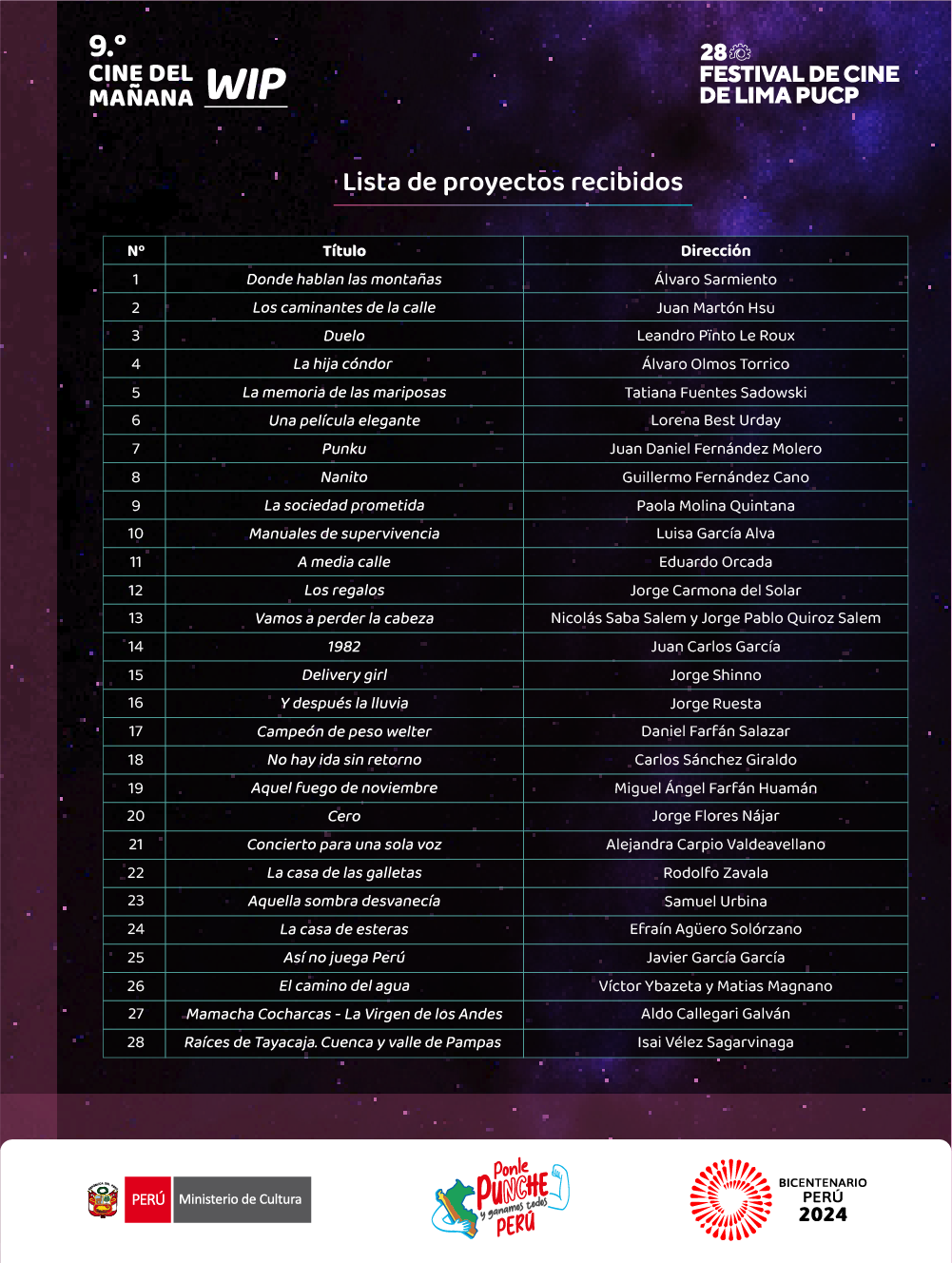 En el marco del 28 Festival de Cine de Lima PUCP, la Dirección del Audiovisual, la Fonografía y los Nuevos Medios (DAFO) del Ministerio de Cultura y el Centro Cultural de la Pontificia Universidad Católica del Perú (CCPUCP) convocan a la novena edición de Cine del mañana – Work in Progress (WIP), sección profesional del festival que presenta proyectos cinematográficos de largometraje en fase de postproducción ante reconocidos programadores de festivales y distribuidores, nacionales e internacionales.