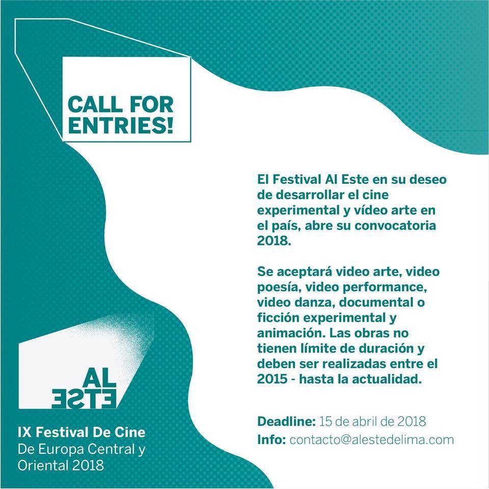 El Festival de cine de Europa Central y Oriental AL ESTE abre la convocatoria para participar en la sección oficial de su IX edición, a realizarse del 30 de mayo al 9 de junio de 2018. Podrán postular largometrajes y cortometrajes de ficción y documental, producidos y/o dirigidos en Europa Central y Oriental, Francia, Argentina y Perú.