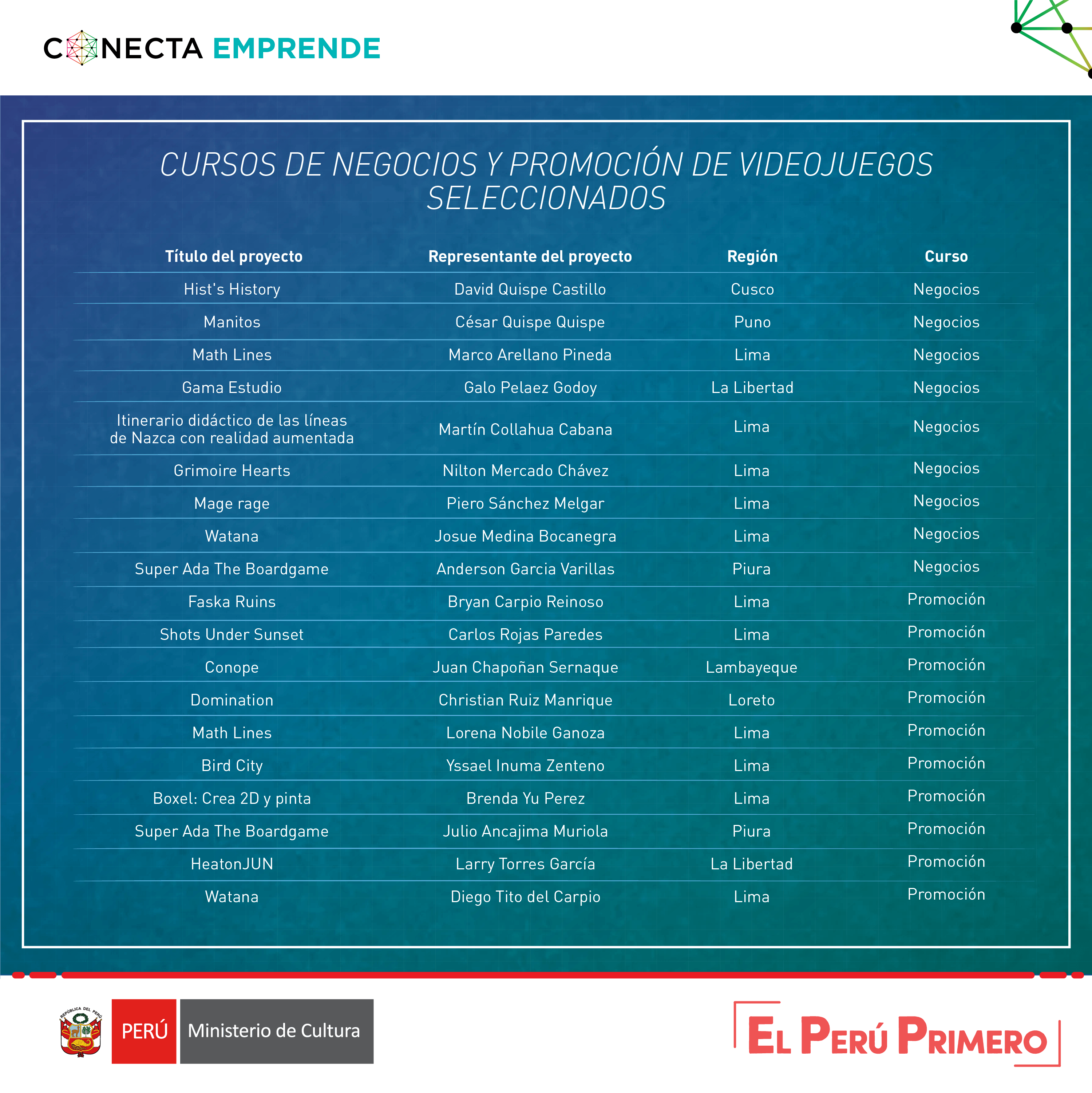 La Dirección del Audiovisual, la Fonografía y los Nuevos Medios (DAFO) del Ministerio de Cultura, en el marco del 8vo Congreso Internacional de Desarrolladores de Videojuegos COIDEV 2020, anuncia la convocatoria de cursos especializados para desarrolladores de videojuegos con el objetivo de brindar herramientas de gestión de negocios y promoción de proyectos de videojuegos en desarrollo a diversos agentes del sector a través de cursos especializados sobre: