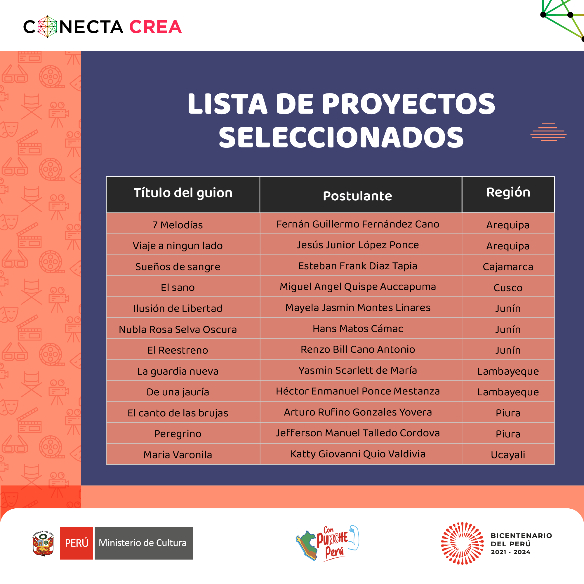 La Dirección del Audiovisual, la Fonografía y los Nuevos Medios (DAFO) del Ministerio de Cultura, en el marco del servicio CONECTA, convoca al "Taller de proyectos cinematográficos – Desarrollo de guion 2023", del 2 al 31 de mayo de 2023, dirigido a guionistas y realizadores(as) que residen en las regiones del país (exceptuando Lima Metropolitana y Callao).