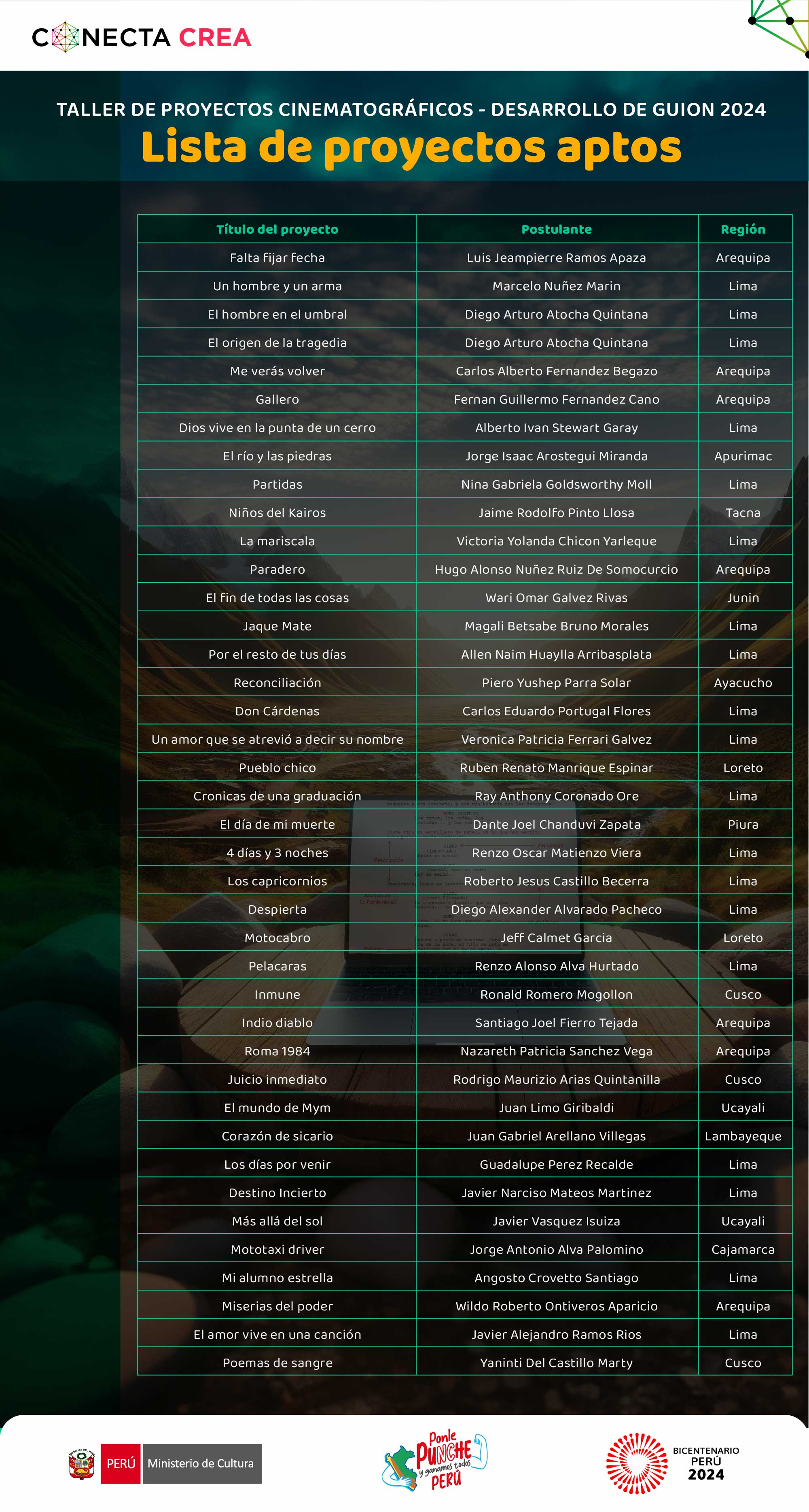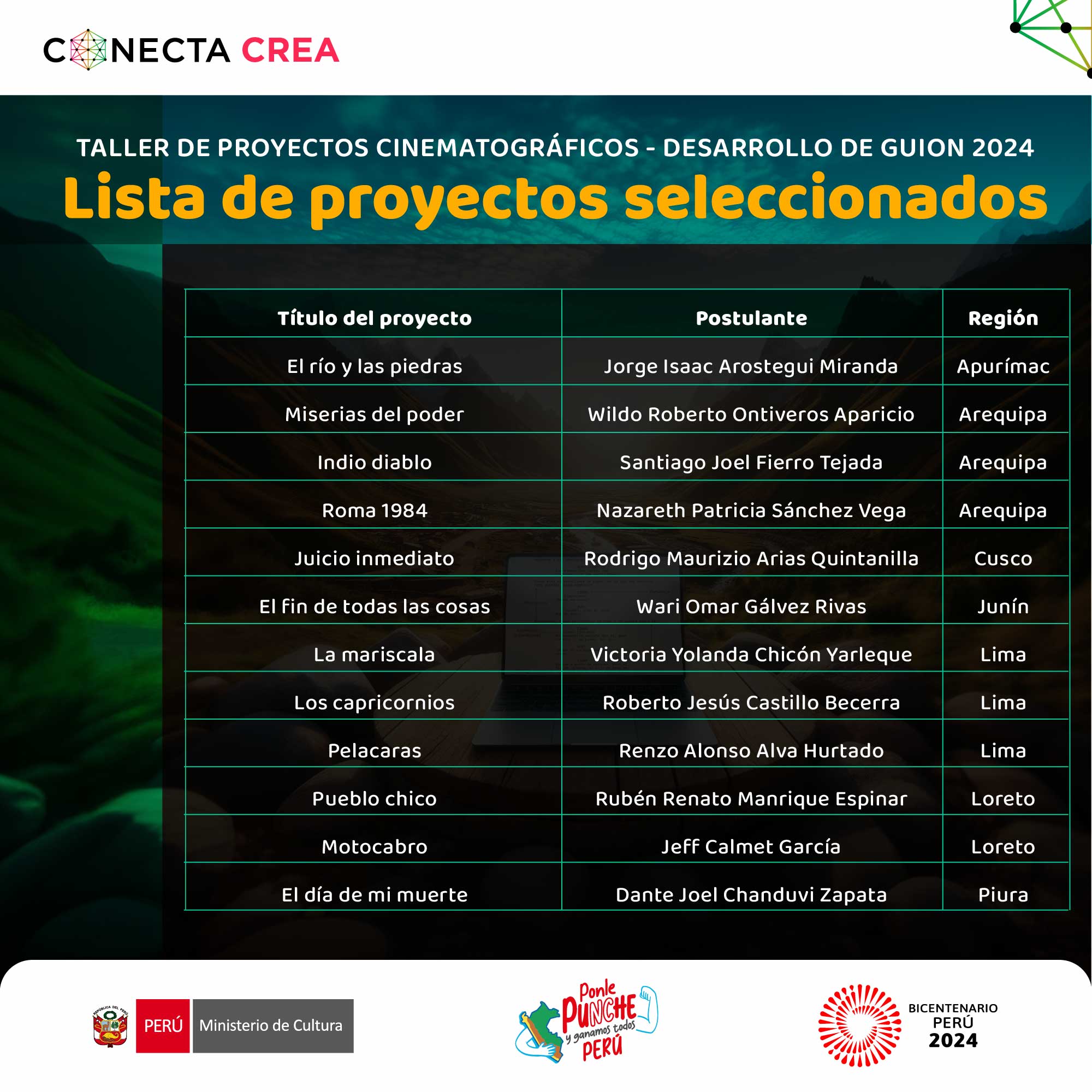 La Dirección del Audiovisual, la Fonografía y los Nuevos Medios (DAFO) del Ministerio de Cultura, en el marco del servicio CONECTA, convoca al ‘Taller de proyectos cinematográficos – Desarrollo de guion 2024’, del 6 al 28 de junio de 2024, dirigido a guionistas y realizadores(as) de todo el país.