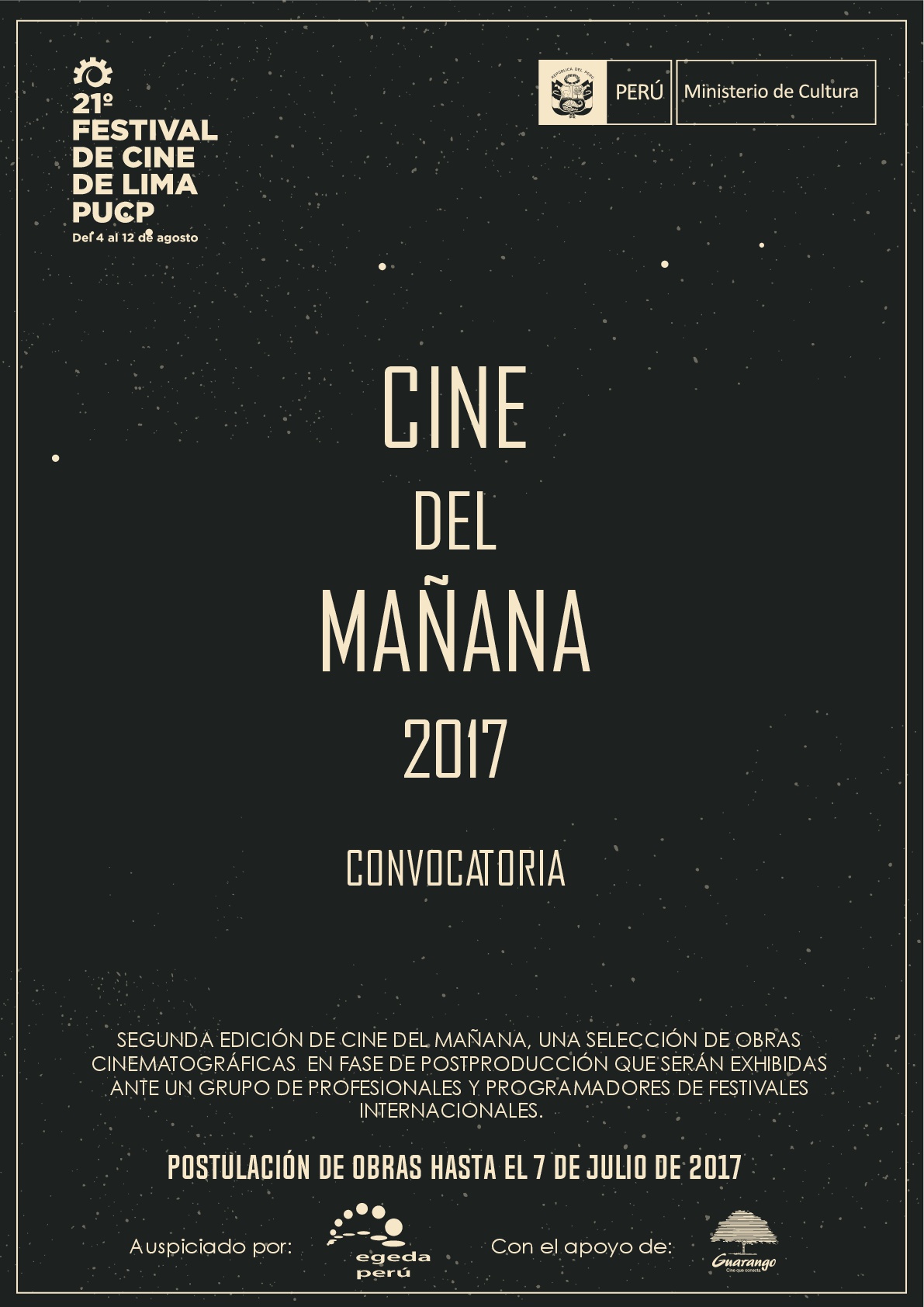 En el marco del 21° Festival de Cine de Lima, la Dirección del Audiovisual, la Fonografía y los Nuevos Medios del Ministerio de Cultura y el Centro Cultural de la Pontificia Universidad Católica del Perú convocan a la segunda edición de Cine del mañana, una selección de obras cinematográficas en fase de post producción que serán exhibidas ante un grupo de profesionales y programadores de festivales internacionales.