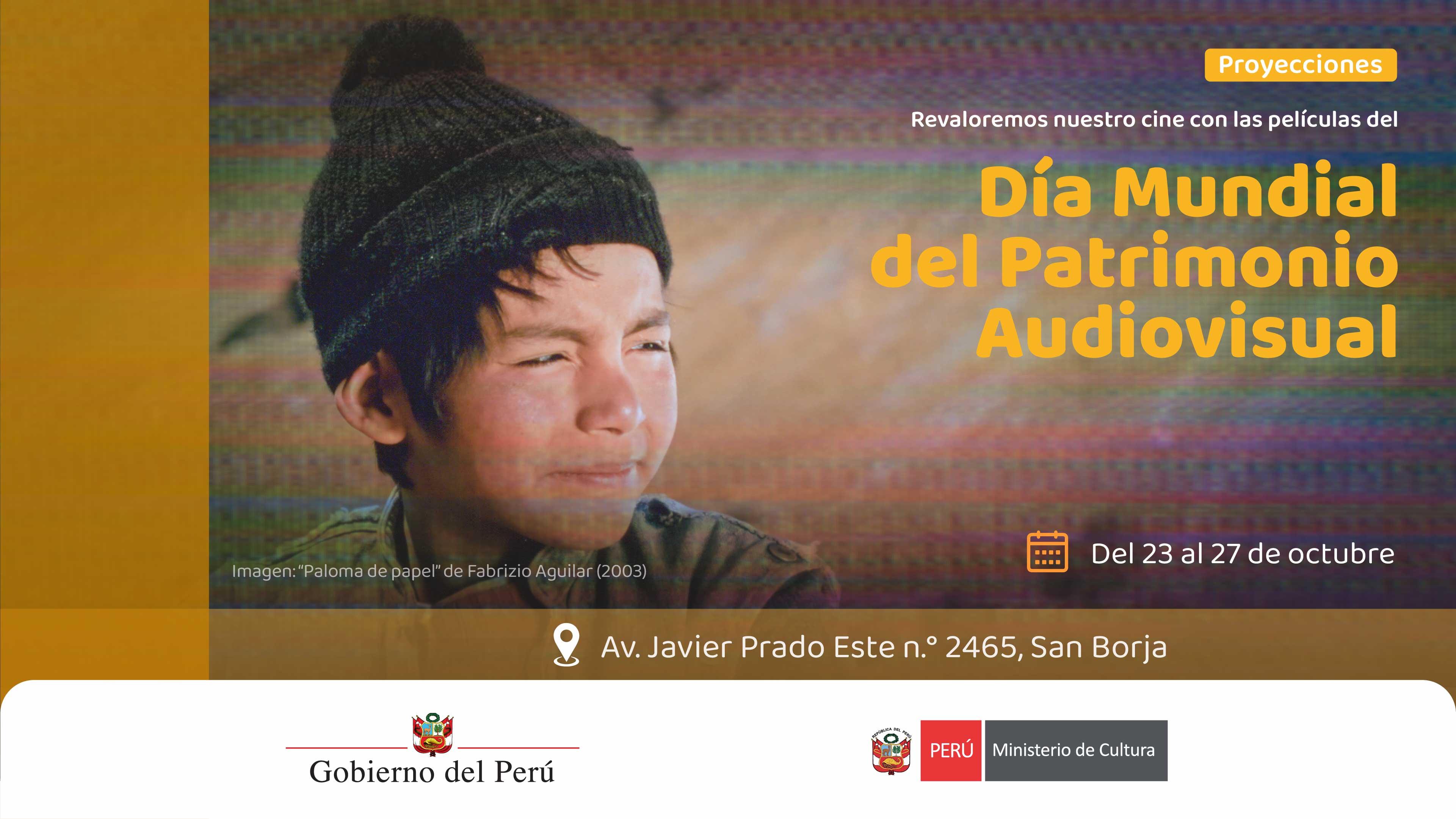 El Ministerio de Cultura del Perú, por medio de la Dirección del Audiovisual, la Fonografía y los Nuevos Medios (DAFO), presenta una selección de películas en el marco de las actividades por la conmemoración del Día Mundial del Patrimonio Audiovisual, un espacio que presentará 6 largometrajes y y un cortometraje peruanos, en dos sedes de la ciudad de Lima.